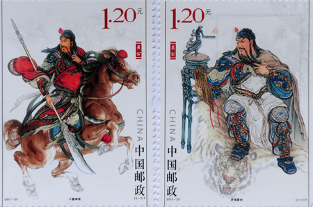 9月12日中秋佳節(jié),《關(guān)公》特種郵票在湖北荊州舉行了首發(fā)揭幕。據(jù)了解,本次中國(guó)郵政發(fā)行的關(guān)公特種郵票,1套2枚,小型張1枚,設(shè)計(jì)者是中國(guó)年輕畫(huà)家晁谷。兩枚郵票分別表現(xiàn)了橫刀立馬的“武關(guān)公”和夜讀春秋的“文關(guān)公”形象,小型張則表現(xiàn)了關(guān)帝廟背景下威風(fēng)凜凜的關(guān)公立像,突出了關(guān)公“神”的形象。