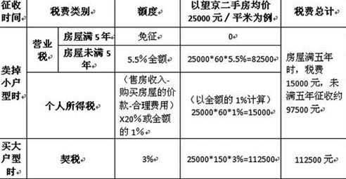 目前,二手房買賣時(shí)需要交納的主要稅費(fèi)為營(yíng)業(yè)稅、個(gè)稅、契稅等,其中營(yíng)業(yè)稅及個(gè)稅為房產(chǎn)交易時(shí)業(yè)主需要交納的部分,而契稅的征收對(duì)象則為購(gòu)房者。以一位賣掉一套60平米的小戶型,再買一套150平米的大戶型的換房者為例,中間將產(chǎn)生哪些稅費(fèi)呢?我愛我家社區(qū)專家為您解析: