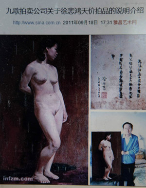 2010年6月,北京九歌國際拍賣有限公司舉行的一場春拍會上,一幅名為《人體蔣碧薇女士》的徐悲鴻油畫作品當場拍出7280萬元的天價。該油畫的拍賣信息被發(fā)布于多家網站,同時配發(fā)的還有“徐悲鴻長子徐伯陽與這幅畫的合影”以及徐伯陽出示的“背書”,內容為:“此幅油畫(人體)確系先父徐悲鴻的真跡,先父早期作品,為母親保留之遺作。徐伯陽2007年9月29日!