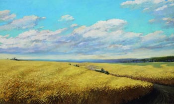 《金色的海洋》創(chuàng)作完成于1956年,尺幅巨大(138×235cm),著錄繁多。作品描繪了一望無垠的麥田,熱烈的金黃色麥田與蔚藍(lán)天空中翻卷的云朵形成鮮明的冷暖對比,具有動感的白云爭相飄往畫面的右上方,從而在視覺上拓寬了整幅畫面的空間感。金色的麥浪跟隨風(fēng)吹的方向同時倒向了畫面的右方,與藍(lán)天白云之間形成了動靜結(jié)合的景象,相得益彰。整幅畫作被由近至遠(yuǎn)的山脈分為兩部分,近處的山坡點綴著熟綠色的樹林,而延展到遠(yuǎn)方的樹木則在畫家的筆下化為了一抹青綠色,和天際邊的麥浪、蒼穹融為一處。在遠(yuǎn)方,收割機(jī)和卡車帶著勞作的人們與收獲的糧食緩緩進(jìn)入觀者視線,右下角的土地和車轍更說明了人與大自然在不同時代的關(guān)系,通過畫面可以充分感受到畫家在時間、空間、色彩等處理手法上的嫻熟。