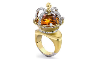 Theo Fennell善于找樂子,這一次,他對風靡全球、大受追崇的皇室婚禮排場表示不屑。對于那些自我感覺配得上金光閃閃的皇室珠寶的人們而言,Theo Fennell提供了皇冠戒指系列供其選擇。對Theo Fennell來說,每件珠寶杰作均是為那些崇尚趣味性以及青睞傳統(tǒng)的人們精心打造的。這些珠寶比茶巾或婚禮杯更有品味。