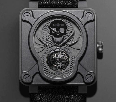 瑞士知名鐘表品牌Bell & Ross推出了萬圣節(jié)特別版腕表。Bell & Ross以BR01的表款為原型,設(shè)計出了表面為骷髏的造型,表帶為黑色珍珠魚皮。限量發(fā)售20只。