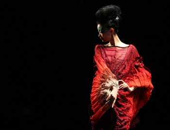 巨大的似木紋年輪又似水墨點染的舞臺背景前,模特身著棉麻天然材質(zhì)服裝,精致的手工細節(jié)與水墨暈染的視覺效果,充分展現(xiàn)了弄影·羅競杰2012春夏時裝發(fā)布會的主題“五行—水木”。