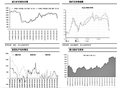 上周(截至2011年11月4日)國(guó)內(nèi)外鐵礦石價(jià)格繼續(xù)下跌,但跌幅趨緩,青島港現(xiàn)貨價(jià)格下降4.8%,唐山鐵精粉價(jià)格小幅下跌0.8%。值得注意的是,國(guó)外礦石價(jià)格在下半周出現(xiàn)回升;上周廢鋼價(jià)格維持前周水平。隨著鋼價(jià)尤其是建材價(jià)格趨穩(wěn),礦石價(jià)格跌幅趨緩,市場(chǎng)氣氛比前期稍有活躍,但目前多數(shù)鋼廠對(duì)鐵礦石采購(gòu)依然保持謹(jǐn)慎態(tài)度,積極性較低。