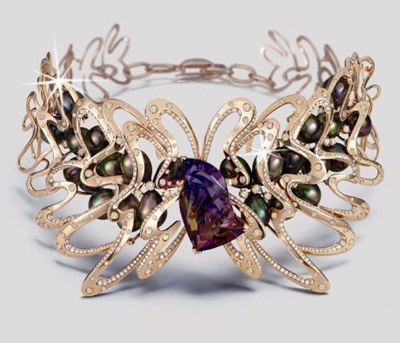 “Sea Duchess”項鏈是Larry Jewelry最新系列“Sea of Colours”中的經(jīng)典之作,靈感來自傳說中珍奇靈動的海洋生物蛟龍,其設(shè)計不但展現(xiàn)出新穎婉約的動人線條,正中更鑲嵌珍貴罕見的50.73克拉雙色紫黃晶寶石,伴以24顆南洋黑珍珠、216顆約7.46克拉的啡鉆及500顆約4.32克拉的白鉆。
