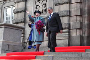 | 丹麥女王瑪格麗特二世(圖左)在丹麥議會(huì)主席莫根斯·呂克托夫特(圖右)的陪同下走出議會(huì)。 |