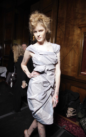 雖然以灰、藍、紫、駝色為主色調的本季時裝與韋斯特伍德過去的設計相比較為暗沉,但與原生態(tài)的民族風格圖案搭配起來更顯自然。不甘寂寞的韋斯特伍德還在其中穿插了飽滿的橙色針織衫、絲巾和酒紅色連褲襪,為寒冷的秋冬季節(jié)帶來一絲暖意。