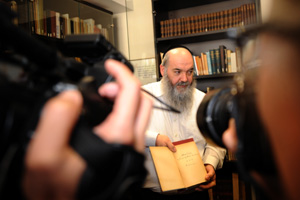 3月19日,耶路撒冷希伯來大學(xué)愛因斯坦檔案館館長羅尼·格羅斯在愛因斯坦私人圖書館內(nèi)向記者展示藏書。愛因斯坦私人圖書館于1987年搬到了耶路撒冷。記者