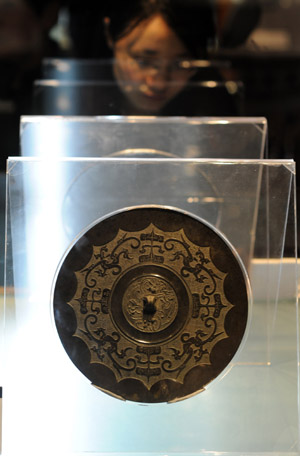 圖為一名女子在展出的戰(zhàn)國時期的花葉龍紋鏡附近參觀。