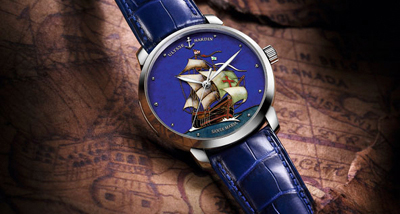 Nardin(雅典表)的Classico「圣瑪利亞號」鎏金限量腕表以這艘尊貴船艦及其冒險(xiǎn)故事為創(chuàng)作題材。選用傳統(tǒng)和珍貴的掐絲琺瑯工藝,配合細(xì)致的琺瑯?biāo)囆g(shù),透過這款表頌揚(yáng)「圣瑪利亞號」的英勇無懼。雅典匠師運(yùn)用鮮艷的色彩,按照嚴(yán)格的規(guī)格,精心雕琢每一個細(xì)節(jié)。在深藍(lán)色的天空襯托下,《圣瑪利亞號》豎起桅桿和帆,在桅桿頂部的旗幟隨風(fēng)飄揚(yáng),藍(lán)綠色的海濺起浪花撲向木制船身,盡顯其雄偉與壯觀。