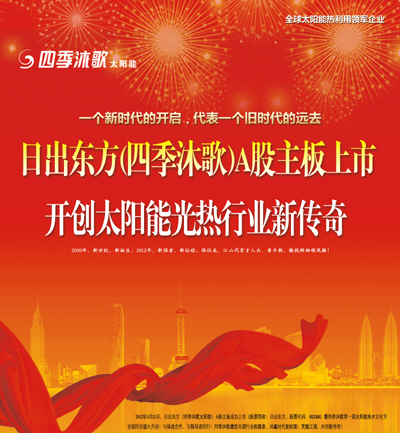 2012年5月21日,四季沐歌強勢登陸上海A股市場(股票名稱:日出東方;股票代碼:603366),兩市節(jié)能減排概念股再添“光熱”生力軍。