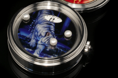 這款A(yù)ngular Momentum五虎盒型懷表將四幅微型老虎畫(huà)像鑲嵌在表中,表蓋是一個(gè)藍(lán)寶石水晶制成的虎寶寶微型畫(huà),內(nèi)蓋是紅虎和黃虎,而白虎像則展現(xiàn)了白虎在藍(lán)色的月光中狩獵的景象,表背水晶顯示則是黑虎的肖像。