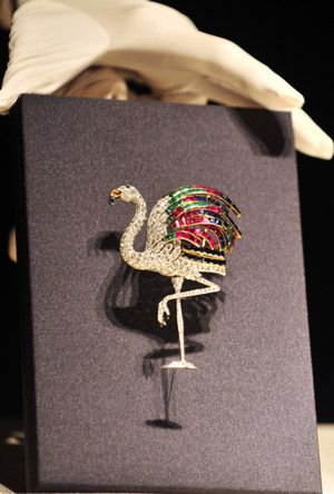 圖為工作人員在臺北故宮博物院圖書文獻大樓開箱展示20世紀英國溫莎公爵夫人佩戴過的“火鶴胸針”。新華社發(fā)