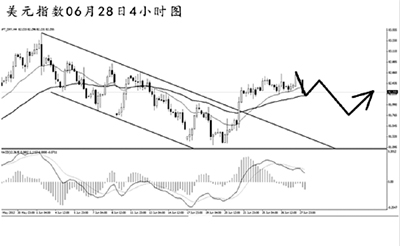 中國銀行北京市分行資金交易員施維判斷,美元指數(shù)6月以來的下降通道已經(jīng)在上周四被向上突破,并且沒有出現(xiàn)對上邊緣的回踩。如果歐盟峰會結(jié)果不佳,那么將會對這次突破形成一個確認(rèn),美元指數(shù)有望結(jié)束此輪回調(diào)。上方的阻力來自6月1日高點(diǎn)83.50。