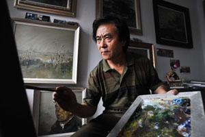 貴陽(yáng)茅草壩職業(yè)畫家村的籌辦者之一、畫家馮志強(qiáng)在自己的工作室內(nèi)作畫。 |
