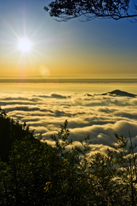 晴天破曉時(shí)分,登阿里山的塔山觀賞云海,確是賞心樂事。游人但見云海茫茫,瞬息萬變,時(shí)而像連綿起伏的冰峰從山谷中冒出,時(shí)而像波濤洶涌的大海,從天外滾滾而來。難怪阿里山的云海被列為臺(tái)灣八景之一。觀日出的地點(diǎn)以祝山為妙,祝山海拔僅次于塔山,為2480米。每當(dāng)黑夜褪去,天空呈現(xiàn)魚肚白,祝山上先露出一絲紅霞,慢慢變成弧形、半圓、大半圓,越來越紅,越來越亮。一輪紅日先從云海邊上升,再從山頂冒出,光芒四射,很是壯觀。