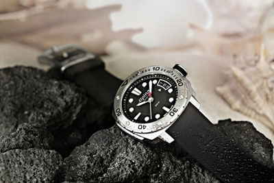另一款式適合男女佩戴著。表殼直徑38mm,觸目的黑色表盤配以亮眼的精鋼表殼,夜光白色刻度在黑色表盤上更為突出,同樣地,特大的日歷視窗設(shè)于3時位置。這個款式一樣配備橡膠材質(zhì)及精鋼表帶以供選擇。