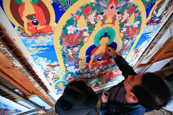 安靜的藏式小院里,桑斗合和他的兒女們?nèi)栽趦煞赐瓿傻奶瓶ㄉ蠈P牡毓蠢彰總細節(jié)。院子的一角,桑斗合3歲的小外孫丹增多杰正有模有樣地拿著畫筆在自己的小畫板上涂抹著,專注的神情絲毫不遜于專心工作的舅舅和媽媽……也許,一名未來的藝術(shù)家正在這個唐卡之家幸福成長。