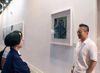 日前,由上海藝博畫廊等發(fā)起成立的“畫廊聯(lián)盟”,在上海紅坊文化藝術(shù)社區(qū)推出了“文化上海:朝向未來的回歸2012畫廊聯(lián)盟展”研討會活動。圖為一位參展的藝術(shù)家在與觀眾交流。資料照片 |