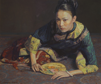中國書畫專拍場將推出吳冠中、林風(fēng)眠、張大千、陳逸飛、常玉等著名畫家的數(shù)幅珍品,最受矚目的當(dāng)屬陳逸飛的油畫作品《斜臥的持扇美人》,畫上有畫家本人的中英文簽名,估價500-700萬港元。
