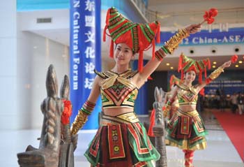 日前結(jié)束的東盟博覽會(huì)上,身著民族服裝的姑娘們敲響銅鼓迎接中外友人。記者周華/攝 |
