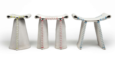 為了制作混凝土帆布座椅,設計師首先制作了一個特殊的木架子,用作塑形的模具。在注水和干燥過程中,這個模具將布料支撐起來,設計師再用藍色、紅色或黃色的線將布縫合以加強凳子的穩(wěn)定性。等到凳子變硬后,模具即可拆除。最終制作完成的凳子不會變形,但使用者可根據需要調整高度、長度和寬度。