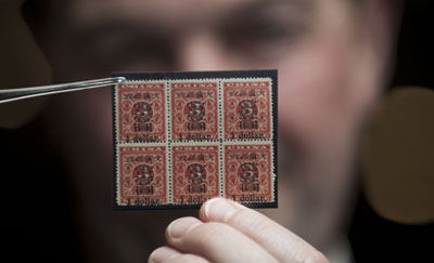 1月8日,郵票專家尼爾·格蘭杰在展示1897年紅印花加蓋3分大字當(dāng)壹圓六方連票,估價(jià)250萬至300萬港元。