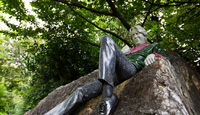 走在都柏林老舊的街區(qū)中,隨時(shí)可以感受逝去的作家文人們留在某個(gè)角落里的靈魂。街頭隨處可見各式各樣的雕塑,其中文學(xué)家的雕像占了很大比例。我住的酒店旁邊就是梅里昂廣場(chǎng)(Merrion Square),幽靜的中心花園中,綠蔭下一個(gè)中年人懶洋洋地倚在一塊大石頭上,一副滿不在乎的表情,略帶挑釁地注視著每個(gè)經(jīng)過的人。這不同尋常的雕塑便是蜚聲文壇、才華橫溢的作家奧斯卡·王爾德(Oscar Wilde)。