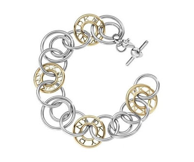 links系列手鏈趣味十足,大大小小的飾品相互交織,共同組成DKNY標(biāo)志性LOGO。這些飾品隨意組合,形成自然的層次感與多維的兩種色調(diào):鍍金色和銀色,閃閃發(fā)光,極具吸引力。