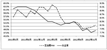目前來看,美國經(jīng)濟正處于穩(wěn)步復蘇階段。在連續(xù)實施量化寬松政策之后,美國一些重要經(jīng)濟數(shù)據(jù)顯示其復蘇勢頭良好,PMI指標開始回升,已連續(xù)兩個月處于50榮枯分界點之上;失業(yè)率也持續(xù)下降,并處于低位運行;而投資者普遍關(guān)注的財政懸崖,也如預期般得到了緩解,暫時不會對商品市場構(gòu)成沖擊。