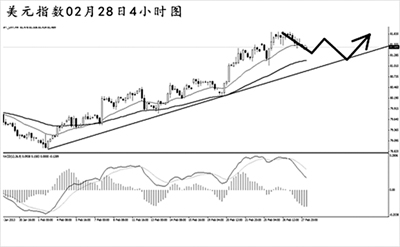 目前美元指數(shù)突破81.40的高點阻力,上方空間被進一步打開。4小時圖均線系統(tǒng)多頭排列,上漲斜率陡峭。由于價格與趨勢線距離較遠,美元指數(shù)面臨一定的下調(diào)風險。小時圖MACD頂背離信號發(fā)揮了效果,美元指數(shù)小幅回落。下方重要的支撐在道氏低點81.00一線,只要美元指數(shù)不跌破此位置,后市仍有繼續(xù)上沖的動力。