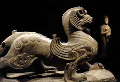 圖為在洛陽博物館內(nèi)陳列的一件東漢年間的“辟邪”大型石雕。