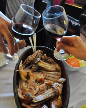 餐館里好不熱鬧,有點摩肩接踵的感覺。烤乳羊是用出生只有21天、除了母乳沒吃過任何雜糧的小羊烤制的,肉質(zhì)絕對細(xì)膩,口感外焦里嫩,而且比烤乳豬少了很多油脂,吃到嘴里回味無窮。如果再配著喝點上好的西班牙葡萄酒,這一餐,絕對是酒不醉人人自醉。