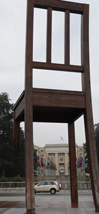 日內瓦的另一把椅子是矗立在聯(lián)合國日內瓦辦事處——萬國宮前的斷椅。這把高12米、重達5噸的椅子只有3條腿著地,第四條腿仿佛被炸去了一截。在萬國宮廣場上,它略顯突兀,并肩身邊的聯(lián)合國難民署、國際電聯(lián)、世界知識產(chǎn)權組織等林立的國際機構大廈,仿佛在向路人述說斷腿的不幸。