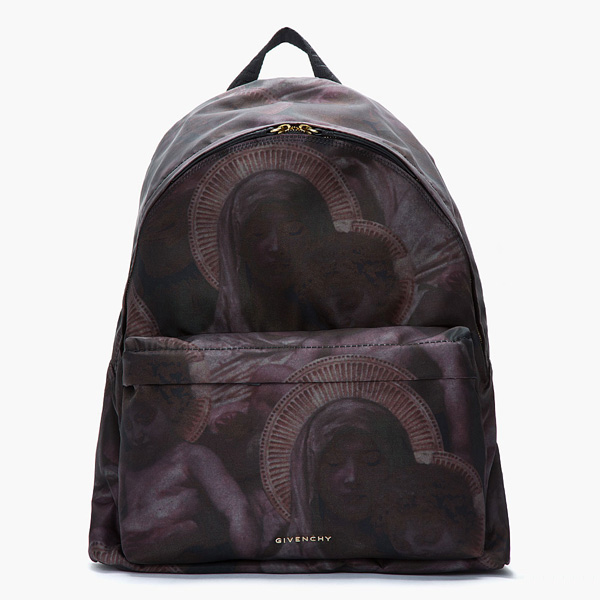 其中一款也是和宗教題材相關(guān)聯(lián),棕色的皮革構(gòu)造出簡(jiǎn)約的包身,前面隱隱約約有圣母和耶穌的班花,但背面卻旗幟鮮明地印著一雙擁吻的情侶,愛(ài)情萬(wàn)歲的主題躍然而出。背帶上還有Givenchy標(biāo)志性的星星的圖案,定價(jià)$1,135美元,ssense.com有售。