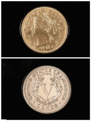 自由女神頭像5美分硬幣是1883年到1912年間美國(guó)發(fā)行流通的硬幣,1913年停產(chǎn)。從1913年開始,硬幣上的圖像換成了人們喜愛的美國(guó)野牛。據(jù)稱,費(fèi)城鑄幣局一名工人1912年底私自鑄造了5枚帶有自由女神頭像的5美分硬幣,并改造模具,印上了1913年字樣。