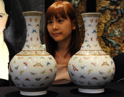 5月20日,工作人員在傳媒預(yù)覽會上展示清光緒粉彩百蝶紋賞瓶。