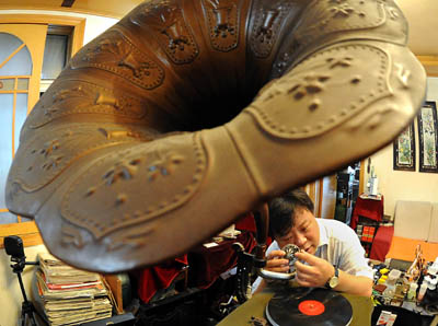 近年來,河南省洛陽市依托厚重的歷史文化資源,全力推動文博事業(yè)發(fā)展。目前,全市已有14家民營博物館通過文物部門審批,另有7家在等待審批,初步形成包括三彩藝術、金銀器、飲食文化、書法藝術、民俗文化在內的民間博物館群,無論是數量還是種類,都位居全省首位。圖為正在籌建唱機唱片博物館的洛陽市民張建洛正在修理他收藏的老式留聲機!