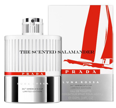 Rossa隊(duì)的努力,Prada發(fā)行了紀(jì)念34屆美洲杯的珍藏版。瓶身下方與噴頭描出平行的線條,代表著AC72對(duì)稱的船型;白色豎紋則代表40公尺高的帆。紅色裝飾突顯了運(yùn)動(dòng)感,但依然忠于品牌崇高與性感的特有標(biāo)志。外盒設(shè)計(jì)加上了Luna