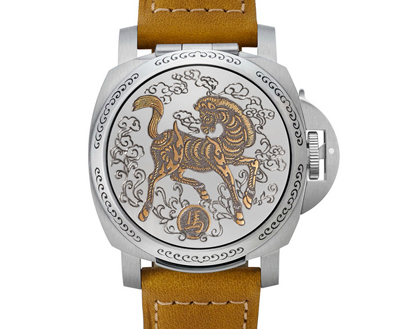 鐫刻駿馬圖案的表蓋打開后便是一面內(nèi)鏡,表蓋內(nèi)藏有灰色表盤,設(shè)有小秒盤和日期顯示窗,呈現(xiàn)簡(jiǎn)約及經(jīng)典的沛納海設(shè)計(jì)特色。Luminor表殼直徑44亳米,AISI