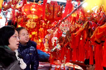 臨近春節(jié),上海豫園小商品市場的新春節(jié)慶商品熱銷,“!弊、春聯(lián)、馬年生肖玩偶等都十分走俏。 圖為一對母女在上海豫園小商品市場選購新春飾品。記者