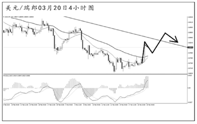 美元兌瑞郎短線發(fā)起強(qiáng)勁反彈。4小時(shí)圖MACD多頭動(dòng)能充盈,目前需重點(diǎn)關(guān)注下降趨勢(shì)線的阻力位0.8850一線,若能升破此位置,匯價(jià)還將展開(kāi)更為強(qiáng)勁的上攻。
