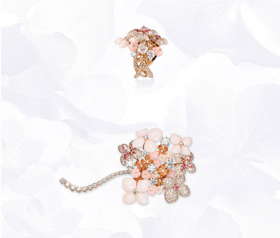 純凈白色的色調(diào)之中暈染一抹象征剛萌芽情懷的粉嫩色調(diào),寶石變成為一朵朵花卉,當(dāng)繡球花展開,便成為無數(shù)由粉紅碧璽組成的花朵,玫瑰金上是精雕細(xì)琢而成的蛋形蛋白石和粉紅色藍(lán)寶石。純凈的美鉆巧妙地結(jié)合彩色寶石,展示珍貴寶石的浪漫一面:一枚盛開著的繡球花戒指,一枚仿如隨風(fēng)搖動(dòng)的胸針,一枚優(yōu)雅精致的神秘腕表,或一條可轉(zhuǎn)化成短項(xiàng)鏈和手鏈的多功能長項(xiàng)鏈。