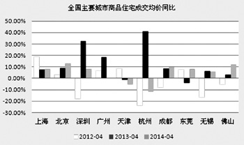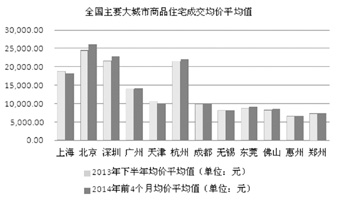 截至2014年5月14日的統(tǒng)計(jì)數(shù)據(jù),我們從13大城市商品房存量套數(shù)排名可以看出:庫存最多的主要集中在浙江和青島,幾乎從去年同期以來就一直處于全國最前列,即使不再有新的商品房推出,去庫存也需要很長一段時間,這也驗(yàn)證了最近樓盤降價新聞報道最多的主要集中在寧波和杭州的事實(shí)。其他城市去化壓力不是非常大,庫存環(huán)比都微幅增加或者減少,同比除了蘇州和福州增幅較大,其他城市增幅在10%上下。因此各主要大城市房價下降的并不明顯。這與下圖2014年前4個月全國主要城市住宅成交價均值也吻合。