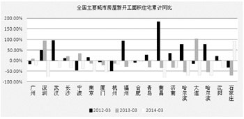 我們從上述數(shù)據(jù)可以看出:房地產(chǎn)市場成交量大幅回落,而房地產(chǎn)開發(fā)商的激情與成交量息息相關(guān)。2013年全國40個大中城市一線,二線城市同比出現(xiàn)小幅下降,三線城市略微上漲,這也和國內(nèi)具體主要城市的房屋新開工面積在2013年漲跌相吻合。當(dāng)時間進(jìn)入到2014年后除了河北石家莊因前期的京津冀一體化政策的影響,新開工面積出現(xiàn)大幅上漲外,其他40個大中城市和國內(nèi)具體主要大城市新開工面積同比全部出現(xiàn)大幅下降,尤其是二線城市降幅更大,因此二線城市地產(chǎn)市場壓力可能會更大一些。