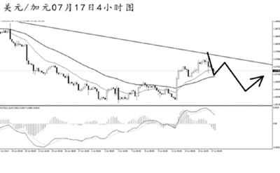 美元兌加元沖高后強(qiáng)力回落。4小時圖的道氏低點(diǎn)支撐在1.0710,預(yù)計(jì)匯價將首先沖擊此位置,若跌破,匯價將重新向1.0620的前方低點(diǎn)一線發(fā)起挑戰(zhàn)。