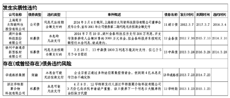 2014年3月4日晚間,上海超日太陽能科技股份有限公司董事會發(fā)布公告,宣布2011年公司債券第二期利息無法按期全額支付,從而構成國內(nèi)首例債券違約事件,并拉開了2014年債務違約的序曲。截至7月,市場上發(fā)生實質(zhì)性違約及有違約風險提示的債券下表。