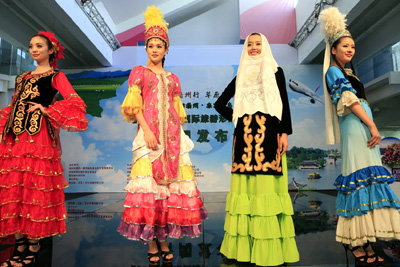 6日,以“運河名城揚州行,草原明珠新源游”為主題的新絲路國際旅游形象大使大賽系列活動在北京拉開序幕。該項賽事將于本月15日-22日分別在江蘇揚州和新疆新源縣開展系列旅游文化和時尚推廣活動,來自中國、俄羅斯、烏克蘭、塞爾維亞、斯洛伐克、立陶宛、波蘭、希臘等國家的模特將在賽事活動中各展風(fēng)采,最終組委會將分別評選出揚州瘦西湖和新疆新源那拉提草原旅游形象大使。圖為模特在“2014新絲路國際旅游形象大使大賽新聞發(fā)布會”上展示新疆哈薩克族民族服飾。