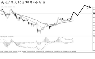 美元兌日元在調(diào)整過后繼續(xù)暴發(fā)出上沖動能。從4小時圖上看,經(jīng)過此波上沖,均線系統(tǒng)重新形成向上的排列,MACD多頭動能再度占優(yōu)。預(yù)計匯價短線小幅調(diào)整過后仍將保持沖高節(jié)奏,但在創(chuàng)出新高之后才能打開進(jìn)一步的上行空間。