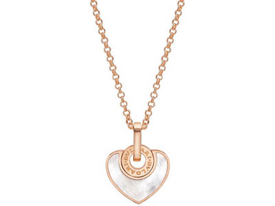 系列,BVLGARI提出清新而極富現(xiàn)代氣息的詮釋。吊墜中心出自線條大膽的雕琢,刻出四種呈現(xiàn)方式:吊座和心形側(cè)邊的鉆石鋪鑲可以翻轉(zhuǎn),因此,可以呈現(xiàn)完整的鉆石鋪鑲,或是鉆石鋪鑲半露,或是帶有商標(biāo)徽記的鉆石鋪鑲半露,或是只用玫瑰金表現(xiàn)的、最簡(jiǎn)單素凈的形式。同時(shí),項(xiàng)鏈上珍珠母貝和雙面心形珍珠母貝的光影與吊墜相互掩映,延伸到三排長(zhǎng)短不一的玫瑰金鏈上。戒指不但襯托妳的玉指,也托住一顆心,可以翻動(dòng),向情人顯露設(shè)計(jì)了徽記的一面,或鉆石的一面。不論選擇了哪一種愛(ài)情表達(dá),任何